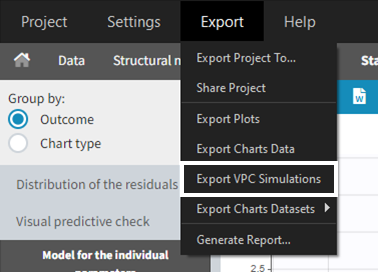 When exporting the charts data, by default the charts data for the VPC include the observed data and predicted percentiles, but not the detailed simulations, which are usually quite large. Starting from the 2020 version, the user can nonetheless choose to include the VPC simulations by clicking on “Export > Export VPC simulations” in the application menu: