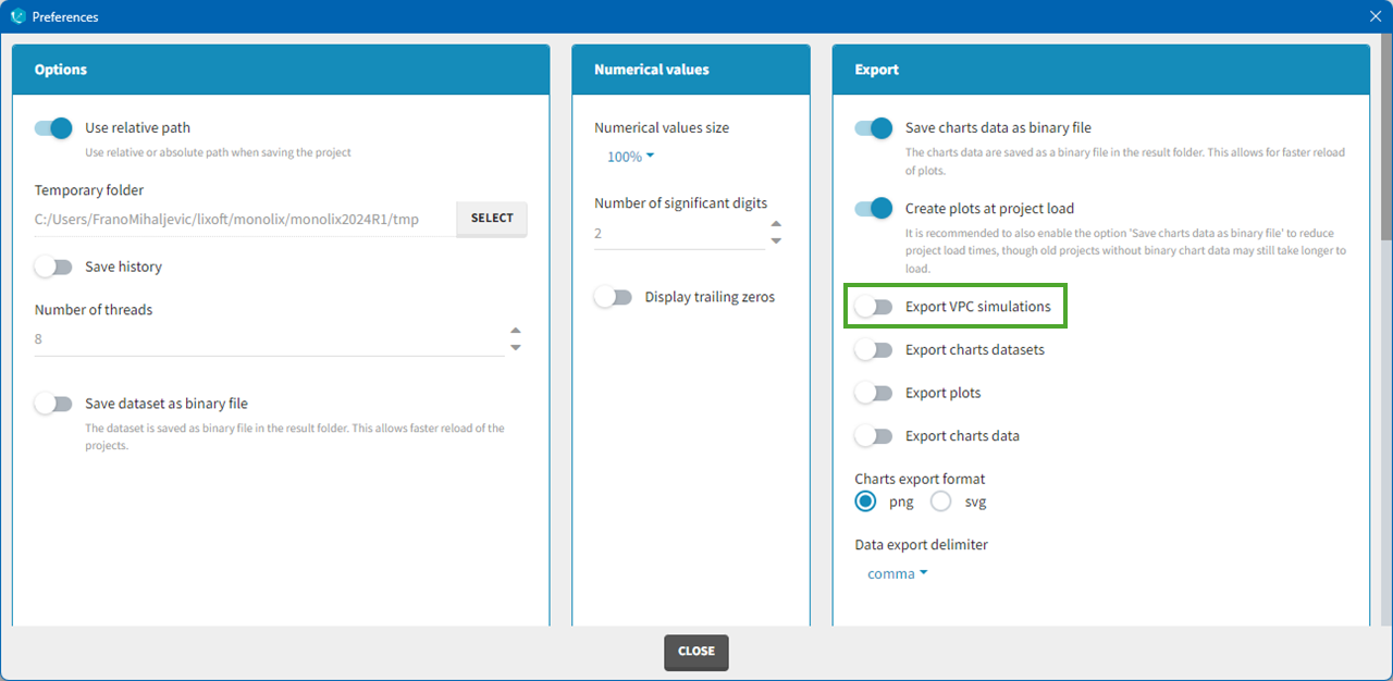 In Monolix2021 it is also possible to include systematically the VPC simulations in the exported charts data with an option in the Preferences: