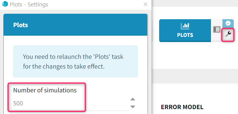 Number of simulations (default: 500): the number of simuated datasets used to generate the VPC can be modified before generating the plots in the settings of the Plots task:
