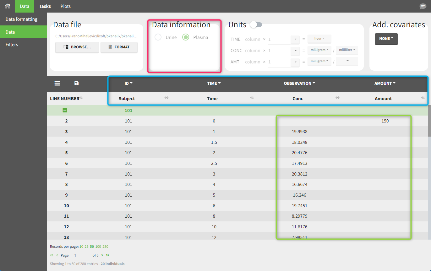 In PKanalix, a dataset is loaded in the Data tab to create a project. After the dataset accepted, it is possible to specify units and filter the dataset, so units and filtering information do not need to be included in the dataset.