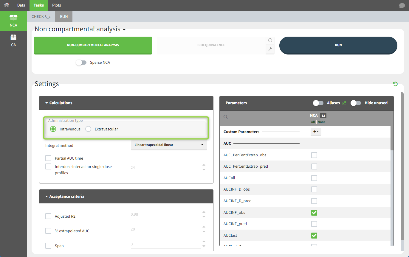 In the “Tasks/Run” tab, the user must indicate that this is intravenous data.