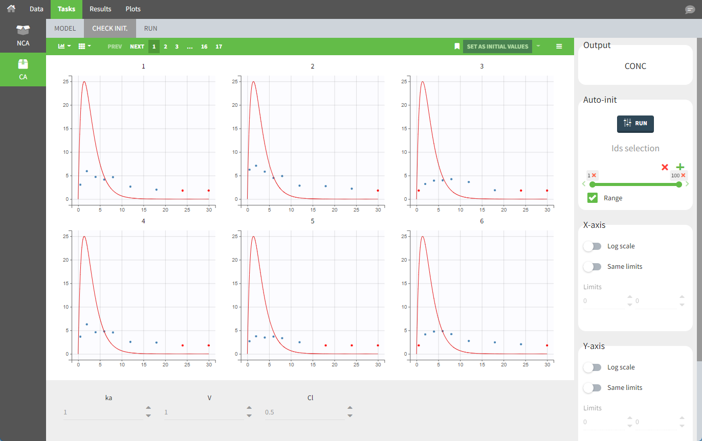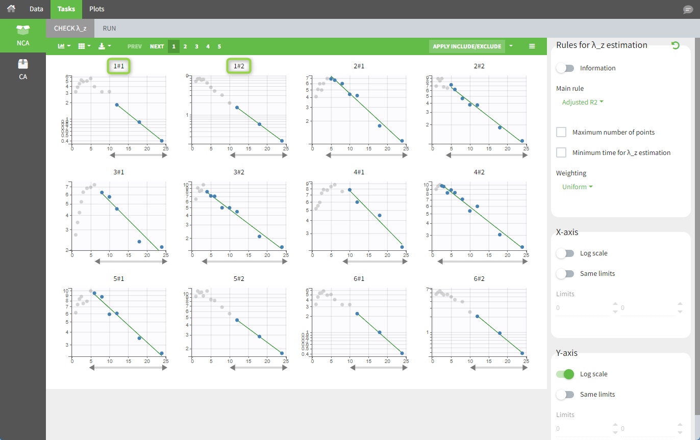 In the “Check lambda_z” tab (for the NCA) and the “Check init.” tab (for CA), each occasion for each individual is displayed. The syntax “1#2” indicates individual 1, occasion 2, according to the values defined in the ID and OCCASION columns.