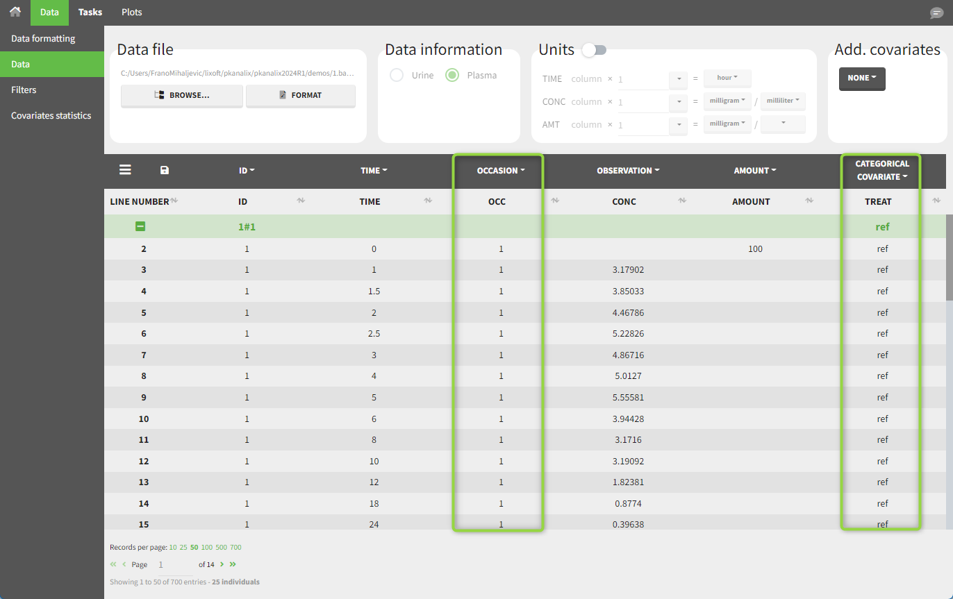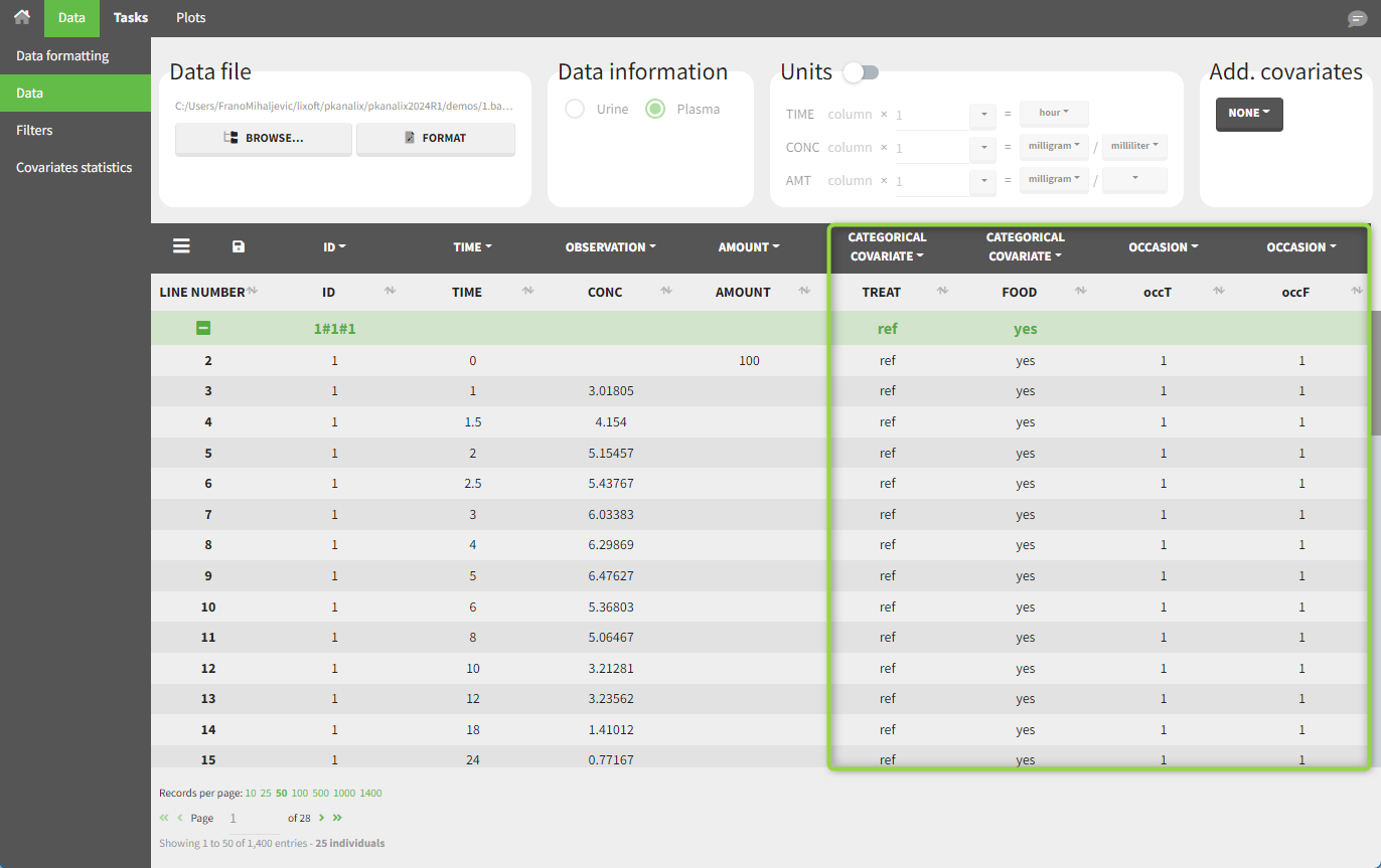 Individual information that should be carried over to output tables and plots must be tagged as CATEGORICAL or CONTINUOUS COVARIATES. Categorical covariates define variables with a few categories, such as treatment or sex, and are encoded as strings. Continuous covariates define variables on a continuous scale, such as weight or age, and are encoded as numbers. Covariates will not automatically be used as “Sort” variables. A dedicated OCCASION column is necessary (see above).