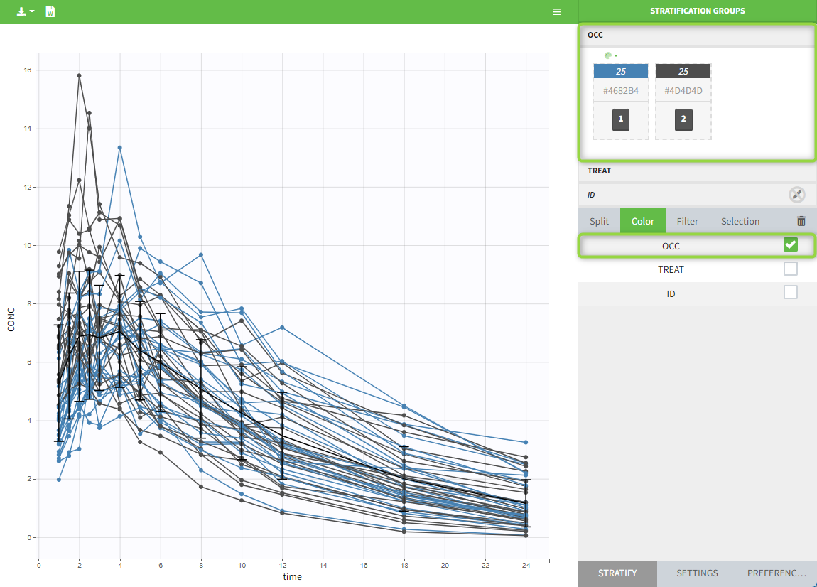 The OCCASION values (here “OCC”) are available to use in the plots for stratification, in addition to possible CATEGORICAL or CONTINUOUS COVARIATES (here “TREAT”).