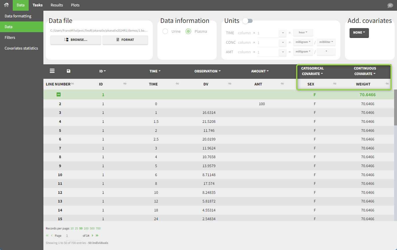In this dataset, “SEX” is tagged as CATEGORICAL COVARIATE and “WEIGHT” as CONTINUOUS COVARIATE.