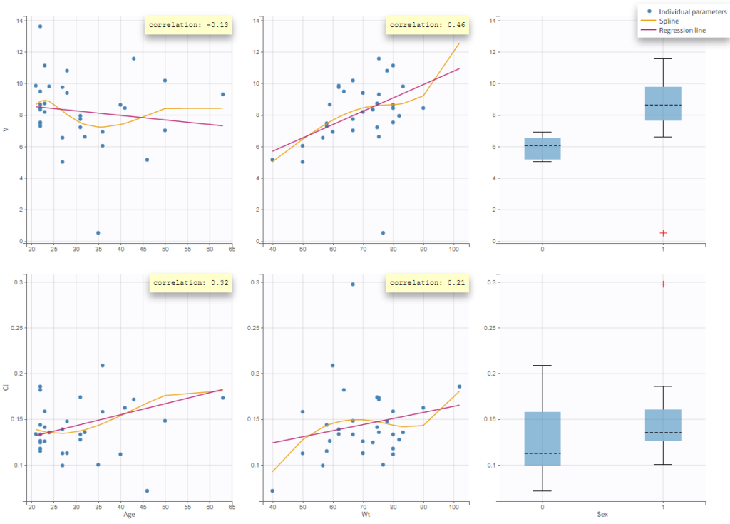 In order to help identifying correlations, regression lines, spline interpolations and correlation coefficients can be overlaid on the plots for continuous covariates. Here we can see a strong correlation between the parameter Cl and the age and the weight. This is the same with V1.