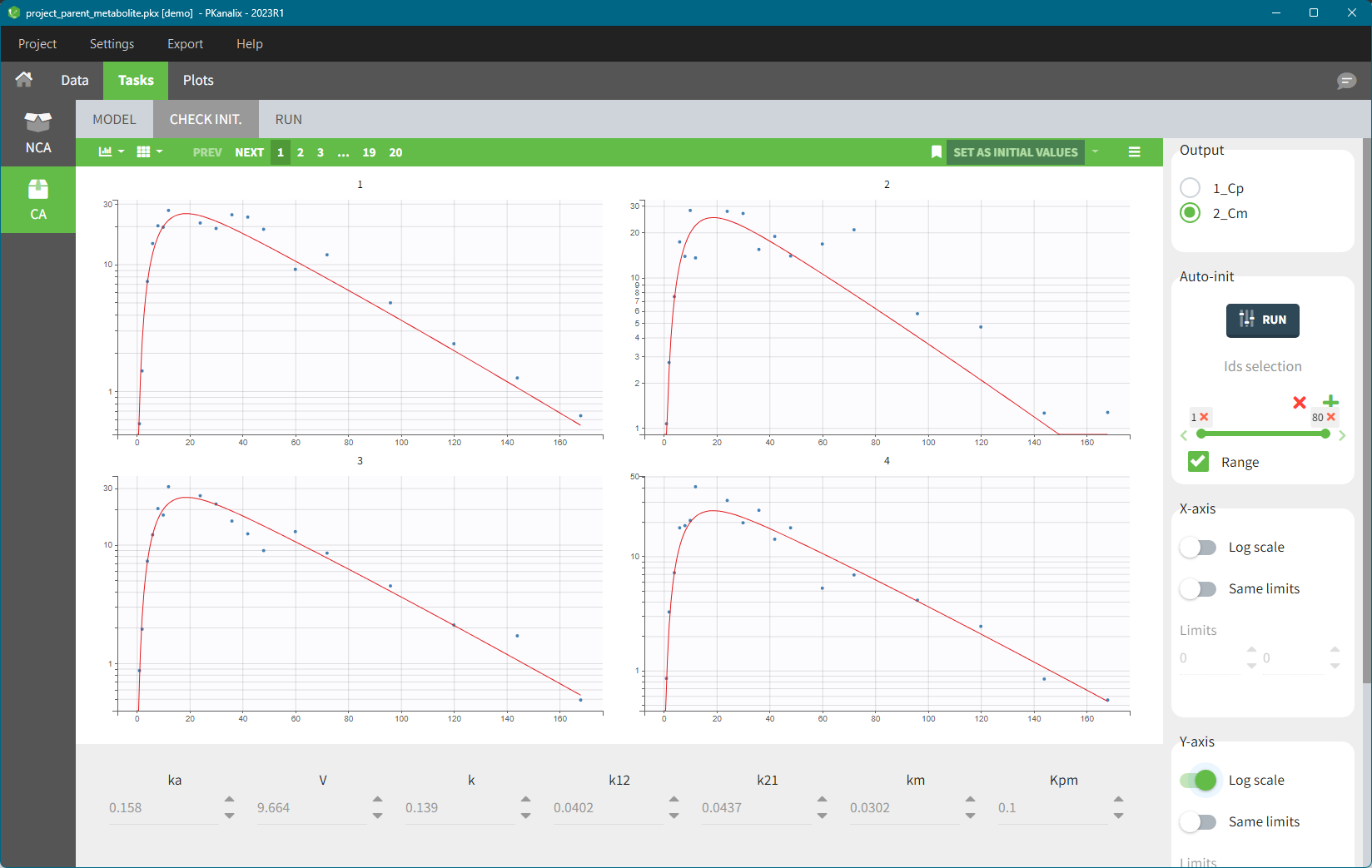 https://youtu.be/IULGI9WqahgAfter clicking on the button RUN, PKanalix computes initial model parameters that best fit the data points using a pooled-fit approach, starting from the current parameter values displayed at the below the plots. By default, the algorithm uses all individual data from all observations mapped to a model output. You can change the set of individuals in the “Ids” selection panel just below the RUN button.