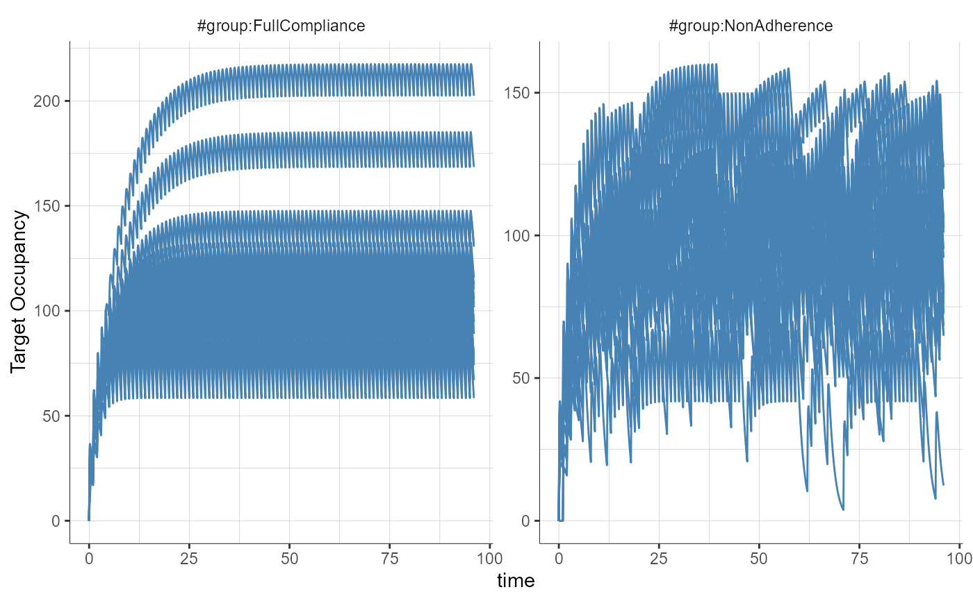 plotObservedData( settings = list(dots = FALSE, ylab = "Target Occupancy"), stratify = list(splitGroup = list(name = "group")), preferences = list(obs = list(lineWidth = 0.5)))
