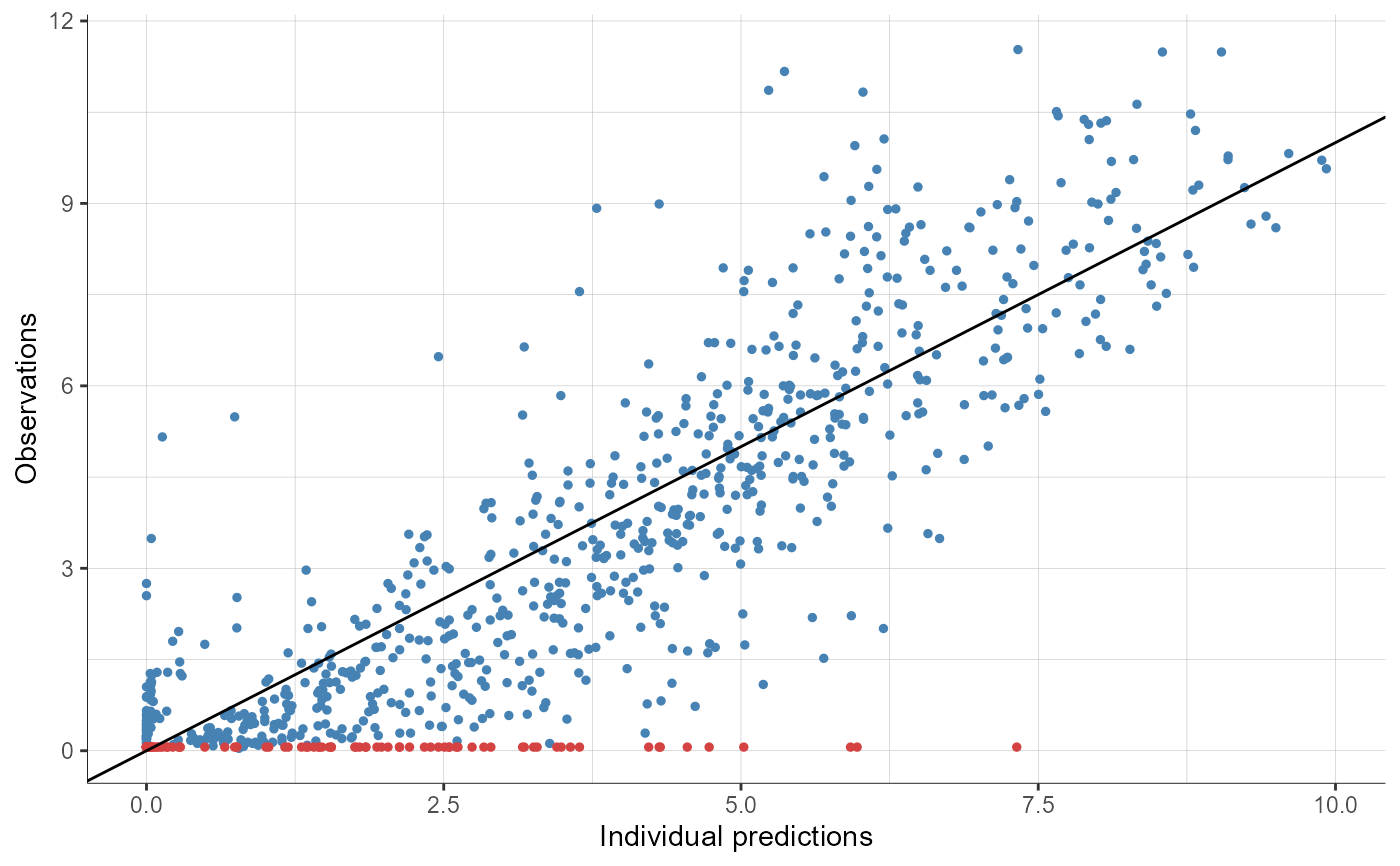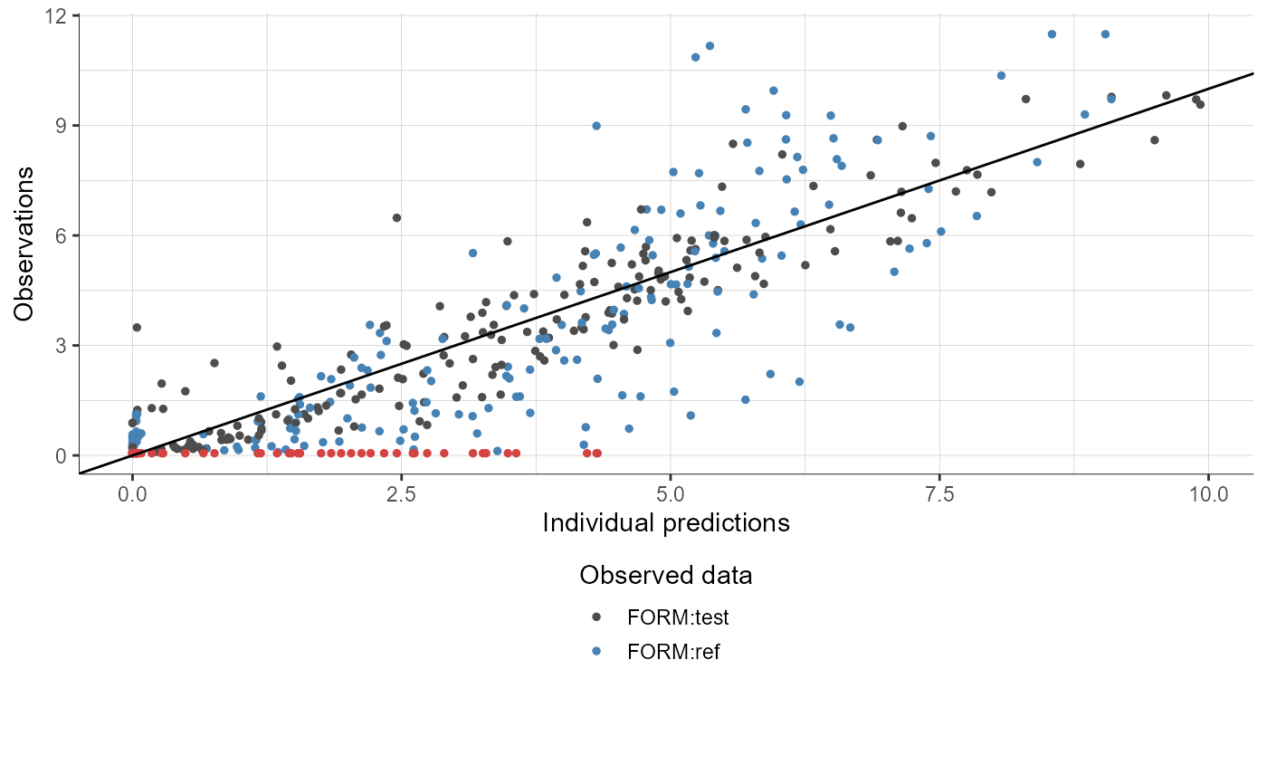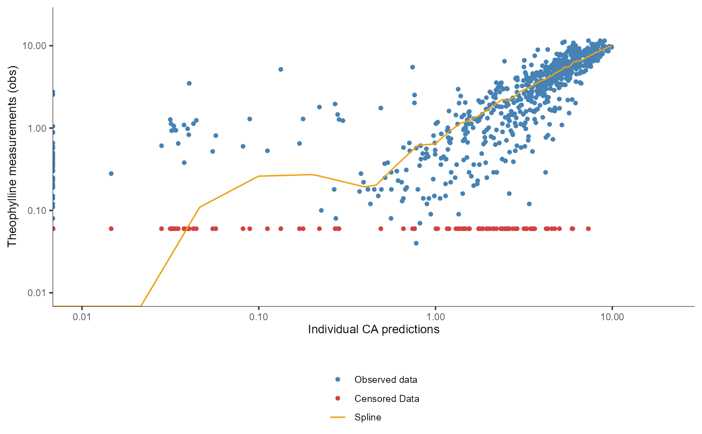 useCensored(logical) Choose to use BLQ data (TRUE) or to ignore it (FALSE, default) to compute the spline.obs(logical) - If TRUE, observations are displayed as dots (default TRUE).cens(logical) - If TRUE, censored observations are displayed as red dots (default TRUE).spline(logical) - If TRUE, spline is displayed (default FALSE).identityLine(logical) - If TRUE, identity line y=x is displayed (default TRUE).legend(logical) If TRUE, plot legend is displayed (default FALSE).grid(logical) If TRUE, plot grid is displayed (default TRUE).xlog(logical) If TRUE, log-scale on x axis is used (default FALSE).ylog(logical) If TRUE, log-scale on y axis is used (default FALSE).ncol(integer) number of columns whensplitis used (default 4).xlim(c(double, double)) limits of the x axis.ylim(c(double, double)) limits of the y axis.xlab(character) label on x axis (default "individual predictions").ylab(character) label on y axis (default "observations").fontsize(integer) Font size of text elements (default 11).scales(character) Should scales be fixed ("fixed"), free ("free", default), or free in one dimension ("free_x", "free_y")