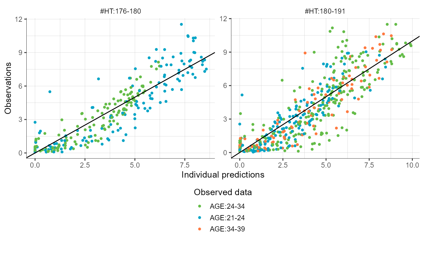 groups- Definition of stratification groups. By default, stratification groups are already defined as one group for each category for categorical covariates, and two groups of equal number of individuals for continuous covariates. To redefine groups, for each covariate to redefine, specify a list with:name character covariate name (e.g "AGE")definition vector(continuous) || list>(categorical) For continuous covariates, vector of break values (e.g c(35, 65)). For categorical covariates, groups of categories as a list of vectors(e.glist(c("study101"), c("study201","study202")))split(vector) - Vector of covariates used to split (i.e facet) the plot (by default no split is applied). For instancec("FORM","AGE").filter(list< list> >) - List of pairs containing a covariate name and the vector of indexes or categories (for categorical covariates) of the groups to keep (by default no filtering is applied). For instance,list("AGE",c(1,3))to keep the individuals belonging to the first and third age group, according to the definition ingroups. For instance,list("FORM","ref")using the category name for categorical covariates.color(vector) - Vector of covariates used for coloring (by default no coloring is applied). Coloring applies to dots of plots w.r.t continuous covariates, but not on histograms or boxplots. For instancec("FORM","AGE").colors- Vector of colors to use whencolorargument is used. Takes precedence over colors defined inpreferences. For instancec("#ebecf0","#cdced1","#97989c").