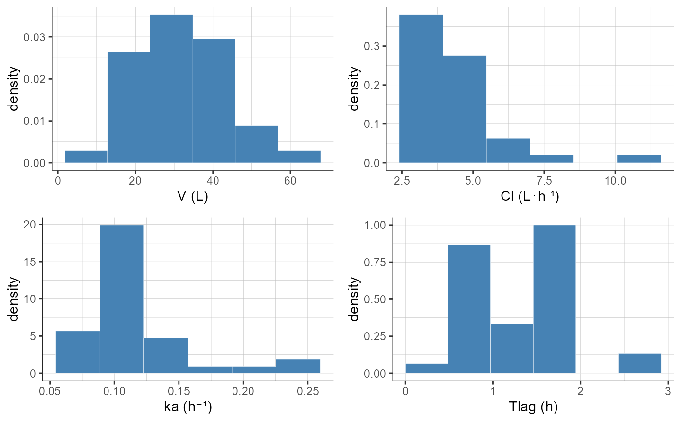 plotCAParametersDistribution(parameters = c('V','Cl','ka','Tlag'),