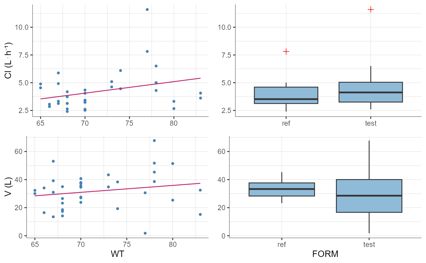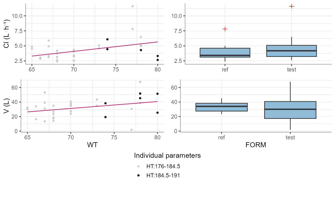 groups- Definition of stratification groups. By default, stratification groups are already defined as one group for each category for categorical covariates, and two groups of equal number of individuals for continuous covariates. To redefine groups, for each covariate to redefine, specify a list with:name character covariate name (e.g "AGE")definition vector(continuous) || list>(categorical) For continuous covariates, vector of break values (e.g c(35, 65)). For categorical covariates, groups of categories as a list of vectors(e.glist(c("study101"), c("study201","study202")))split(vector) - Vector of covariates used to split (i.e facet) the plot (by default no split is applied). For instancec("FORM","AGE").filter(list< list> >) - List of pairs containing a covariate name and the vector of indexes or categories (for categorical covariates) of the groups to keep (by default no filtering is applied). For instance,list("AGE",c(1,3))to keep the individuals belonging to the first and third age group, according to the definition ingroups. For instance,list("FORM","ref")using the category name for categorical covariates.color(vector) - Vector of covariates used for coloring (by default no coloring is applied). Coloring applies to dots of plots w.r.t continuous covariates, but not on histograms or boxplots. For instancec("FORM","AGE").colors- Vector of colors to use whencolorargument is used. Takes precedence over colors defined inpreferences. For instancec("#ebecf0","#cdced1","#97989c").