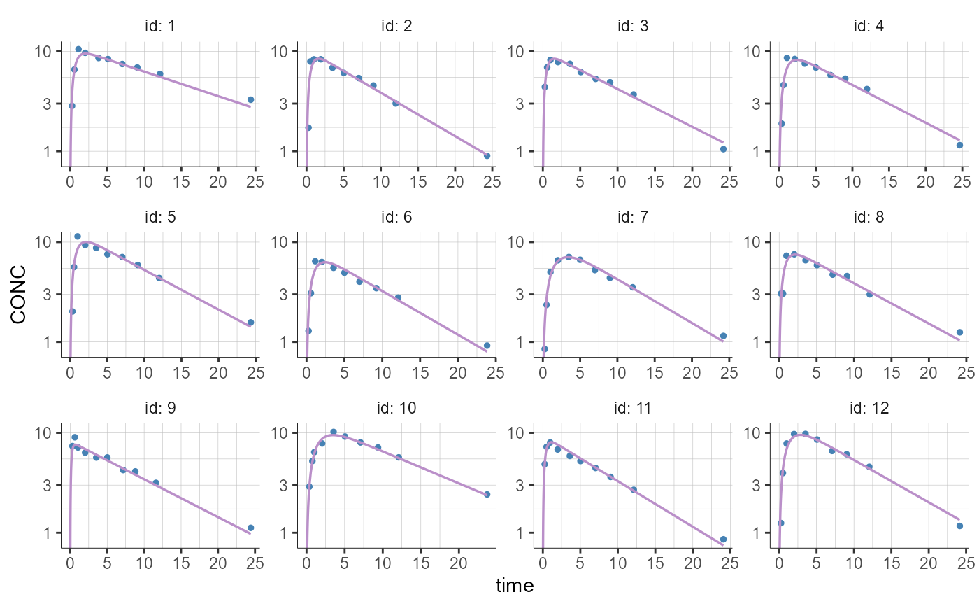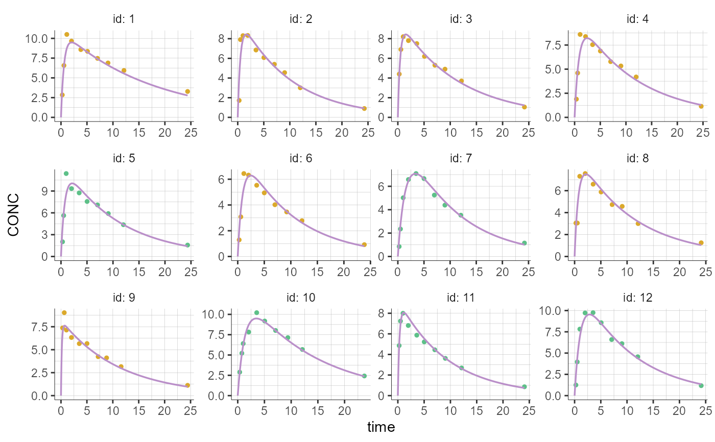 indivEstimate(character) Calculation of individual estimates: conditional mean ("mean"), conditional mode with EBE's ("mode") (default "mode") .obsDots(logical) - If TRUE individual observations are displayed as dots (default TRUE).obsLines(logical) - If TRUE individual observations are displayed as lines (default FALSE).cens(logical) - If TRUE censored intervals are displayed (default TRUE).indivFits(logical) - If TRUE individual fits are displayed (default TRUE).popFits(logical) - If TRUE population fits (typical individual) are displayed (default FALSE).popCov(logical) - If TRUE population fits (individual covariates) are displayed (default FALSE).predMedian(logical) - If TRUE median of individual fits computed based on multiple simulations (default FALSE).predInterval(logical) - If TRUE 90 % prediction interval of individual fits computed based on multiple simulations (default FALSE).splitOccasions(logical) - If TRUE occasions are displayed on separate plots (default TRUE).dosingTimes(logical) - Add dosing times as vertical lines (default FALSE).legend(logical) add (TRUE) / remove (FALSE) plot legend (default FALSE).grid(logical) add (TRUE) / remove (FALSE) plot grid (default TRUE).xlog(logical) add (TRUE) / remove (FALSE) log scaling on x axis (default FALSE).ylog(logical) add (TRUE) / remove (FALSE) log scaling on y axis (default FALSE).xlab(character) label on x axis (default "Time").ylab(character) label on y axis (default obsName).ncol(integer) number of columns when facet = TRUE (default 4).xlim(c(double, double)) limits of the x axis.ylim(c(double, double)) limits of the y axis.fontsize(integer) Plot text font size.scales(character) Should scales be fixed ("fixed"), free ("free", the default), or free in one dimension ("free_x", "free_y") (default "free").