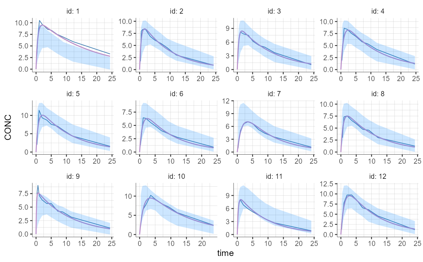 plotIndividualFits(settings=list(obsLines = T, obsDots = F, predInterval = T))