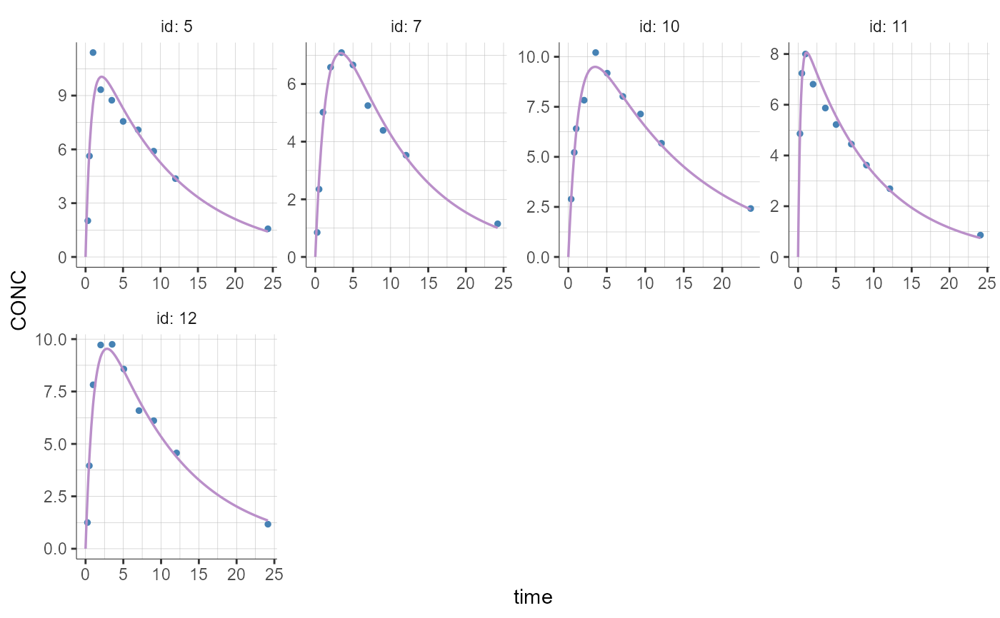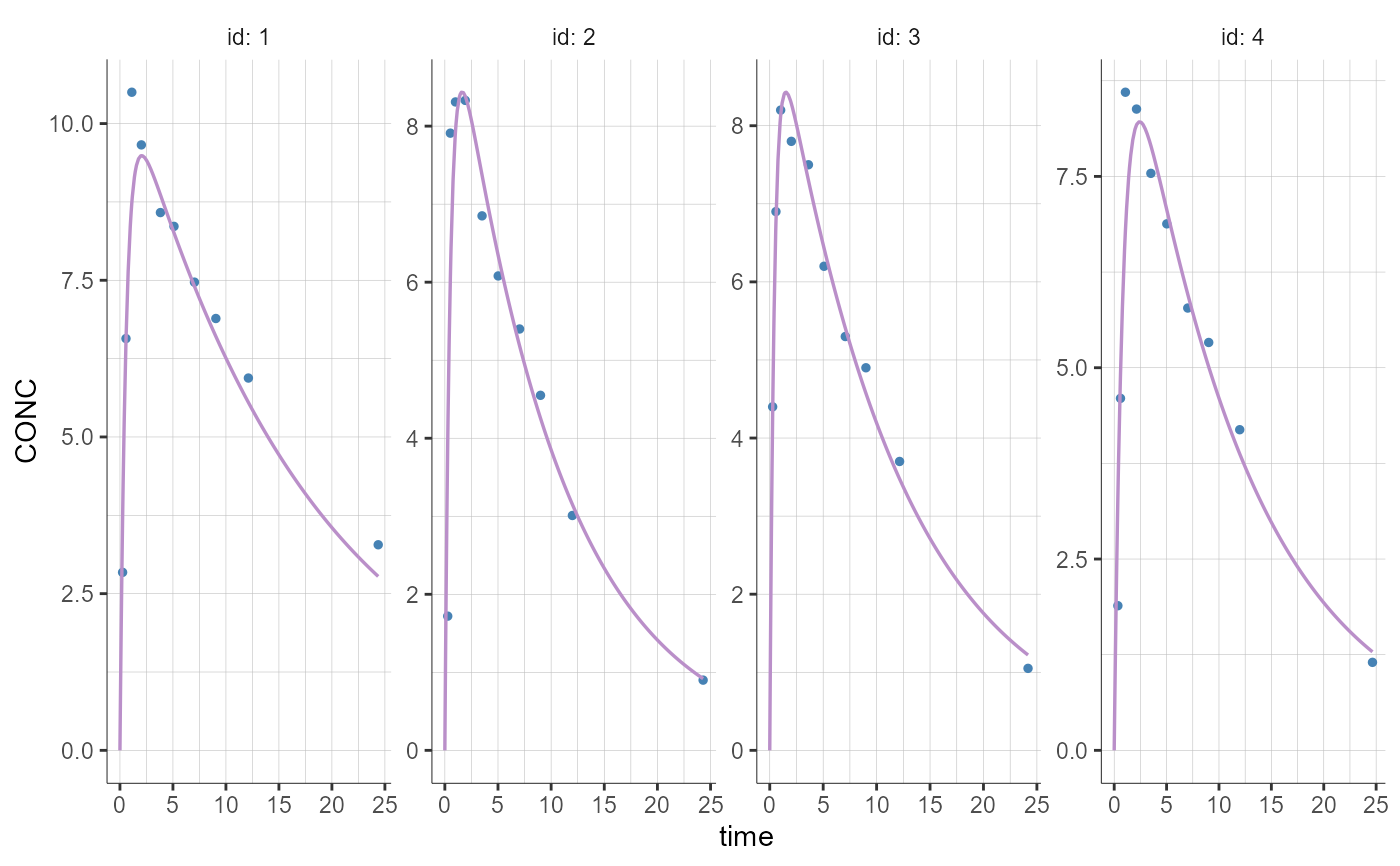 plotIndividualFits(stratify = list(individualSelection = list(ids = c(1, 2, 3, 4))))
