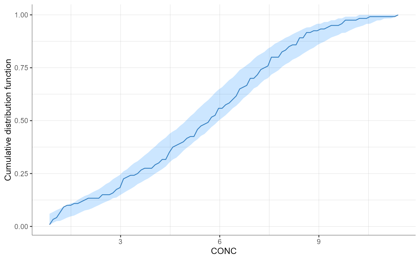 level(integer) level for prediction intervals computation (default 90).nbPoints(integer) Number of points for cdf grid computation (default 100).useCensored(logical) Choose to use BLQ data (TRUE) or to ignore it (FALSE) to compute the VPC (default TRUE). For continuous data only.censoring(character) BLQ data can be simulated ('simulated'), or can be equal to the limit of quantification ('loq') (default 'simulated'). For continuous data only.empirical(logical) - If TRUE, Empirical data is displayed (default TRUE): empirical percentiles for continuous data; empirical probability for discrete data; empirical curve for event datatheoretical(logical) - If TRUE, median is displayed (default FALSE): median of predicted percentilespredInterval(logical) - If TRUE, Prediction interval is displayed (default TRUE).outlierAreas(logical) -If TRUE Add red areas indicating empirical percentiles that are outside prediction intervals (default TRUE).legend(logical) add (TRUE) / remove (FALSE) plot legend (default FALSE).grid(logical) add (TRUE) / remove (FALSE) plot grid (default TRUE).xlog(logical) add (TRUE) / remove (FALSE) log scaling on x axis (default FALSE).ylog(logical) add (TRUE) / remove (FALSE) log scaling on y axis (default FALSE).xlab(character) label on x axis (default "Time").ylab(character) label on y axis (default obsName).ncol(integer) number of columns when facet = TRUE (default 4).xlim(c(double, double)) limits of the x axis.ylim(c(double, double)) limits of the y axis.fontsize(integer) Plot text font size.scales(character) Should scales be fixed ("fixed"), free ("free", the default), or free in one dimension ("free_x", "free_y") (default "free").