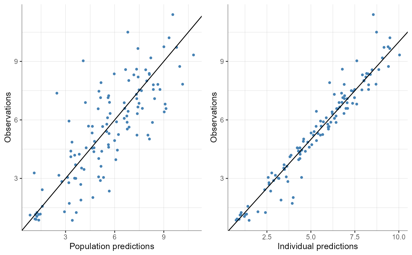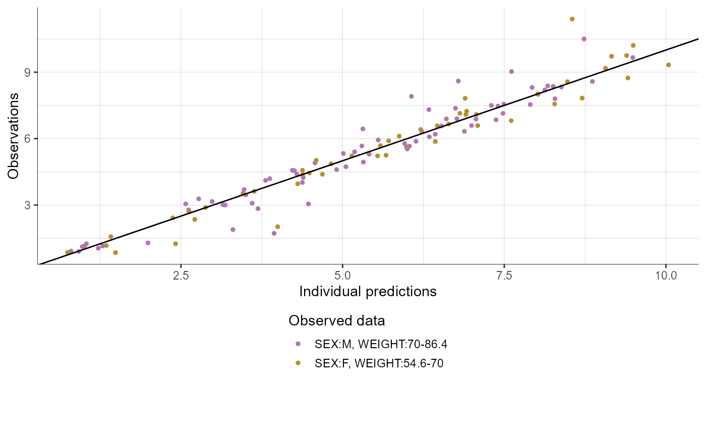 indivEstimate(character) Calculation of individual estimates: conditional mean ("mean"), conditional mode with EBE's ("mode"), conditional distribution ("simulated") (default "mode").useCensored(logical) Choose to use BLQ data (TRUE) or to ignore it (FALSE) to compute the statistics (default TRUE).censoring(character) BLQ data can be simulated ('simulated'), or can be equal to the limit of quantification ('loq') (default 'simulated').obs(logical) - If TRUE observations are displayed as dots (default TRUE).cens(logical) - If TRUE censoring data are displayed as red dots (default TRUE).spline(logical) - If TRUE add spline (default FALSE).identityLine(logical) - If TRUE add identity line (default TRUE).predInterval(logical) - If TRUE add 90% prediction interval (default FALSE).legend(logical) add (TRUE) / remove (FALSE) plot legend (default FALSE).grid(logical) add (TRUE) / remove (FALSE) plot grid (default TRUE).xlog(logical) add (TRUE) / remove (FALSE) log scaling on x axis (default FALSE).ylog(logical) add (TRUE) / remove (FALSE) log scaling on y axis (default FALSE).ncol(integer) number of columns when facet = TRUE (default 4).xlim(c(double, double)) limits of the x axis.ylim(c(double, double)) limits of the y axis.fontsize(integer) Plot text font size.scales(character) Should scales be fixed ("fixed"), free ("free", the default), or free in one dimension ("free_x", "free_y") (default "free").ylab(character) label on y axis (default "Observations").