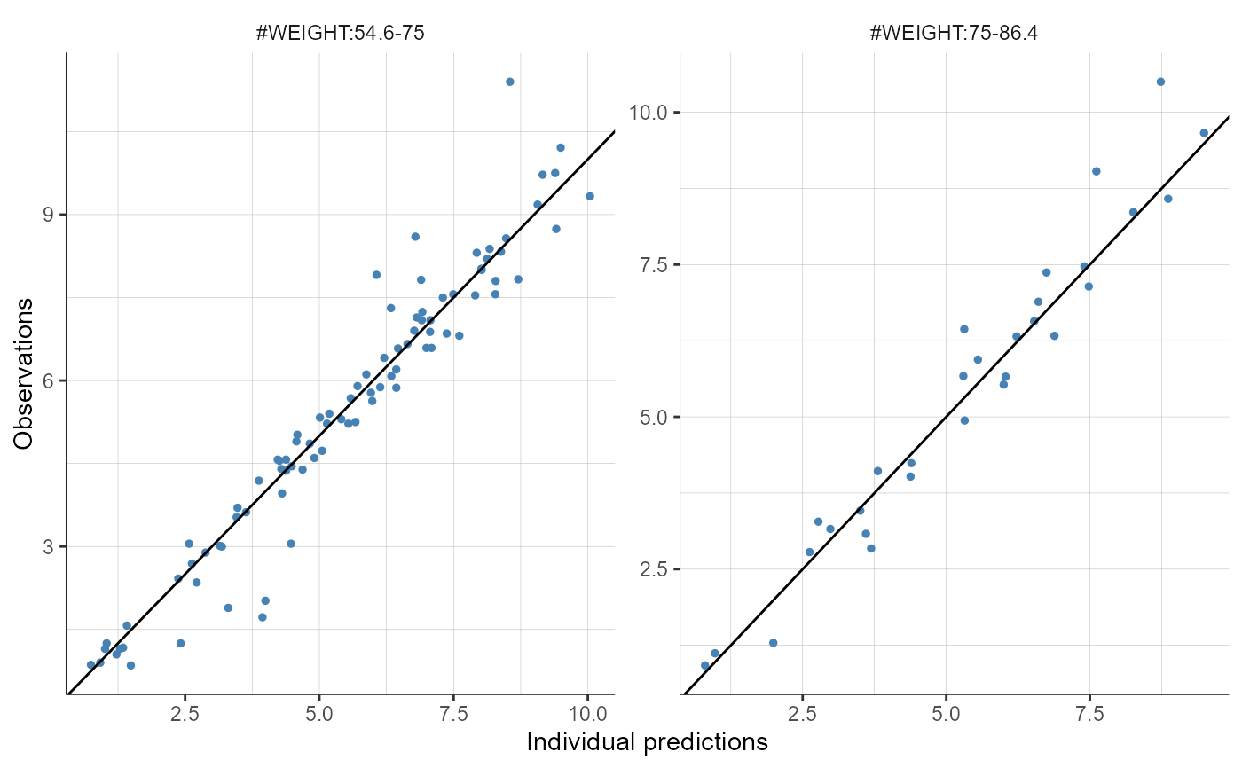 plotObservationsVsPredictions(stratify = list(color = "WEIGHT",