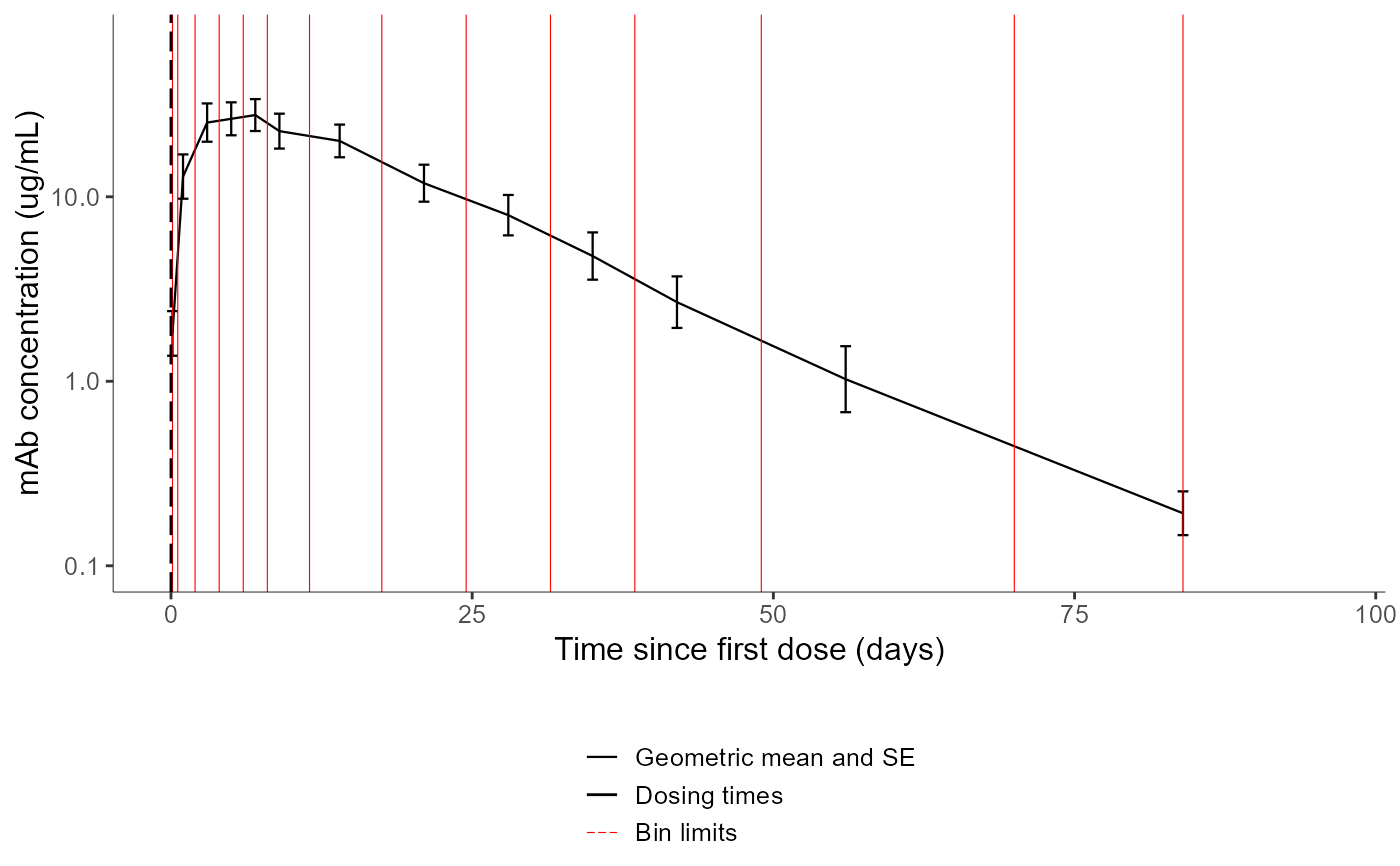 # changing the settings to display only the mean curve with SE, with bin limits and dosing times