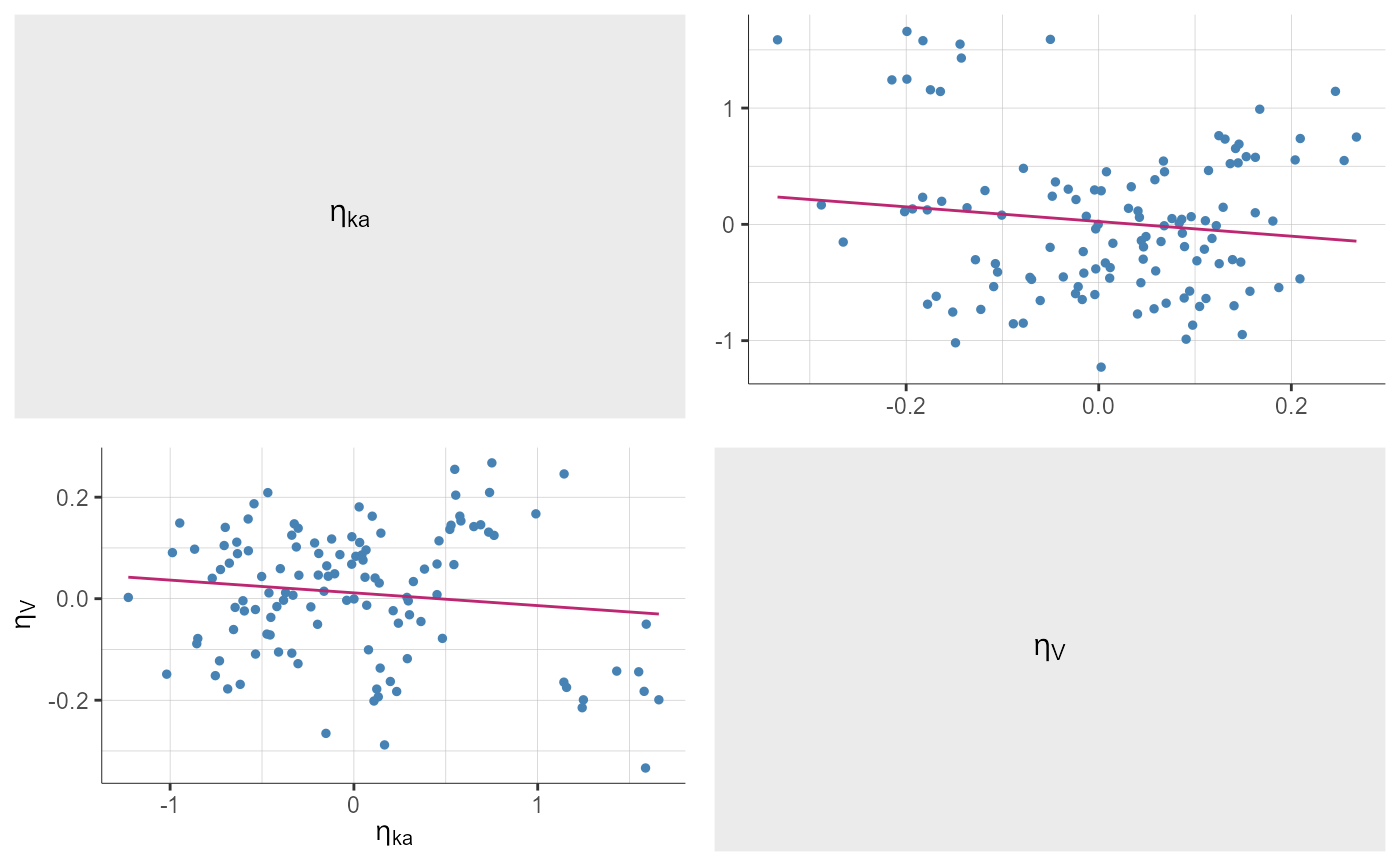 plotRandomEffectsCorrelation(parametersRows = "ka", parametersColumns = "V",