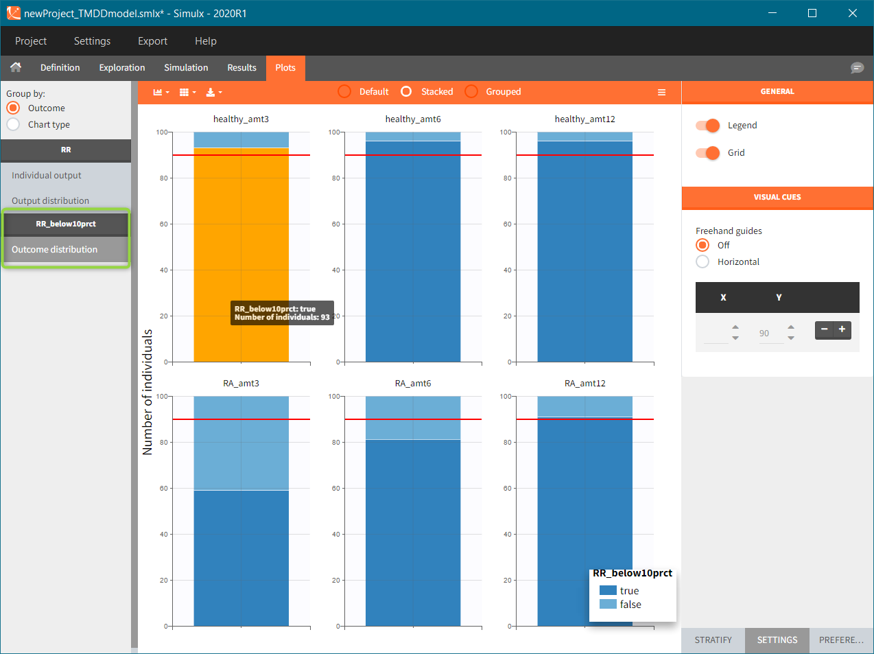 To run the simulation and the calculation of the endpoints it is enough to select both tasks and click the button “Run”. Generation of the results and plots is automatic in two dedicated tabs. The outcome distribution shows that the efficacy of the treatment in healthy individuals stays above 90% (red line) for all dose levels. On the contrary, a group with rheumatoid arthritis achieves this level only at the highest tested dose.
