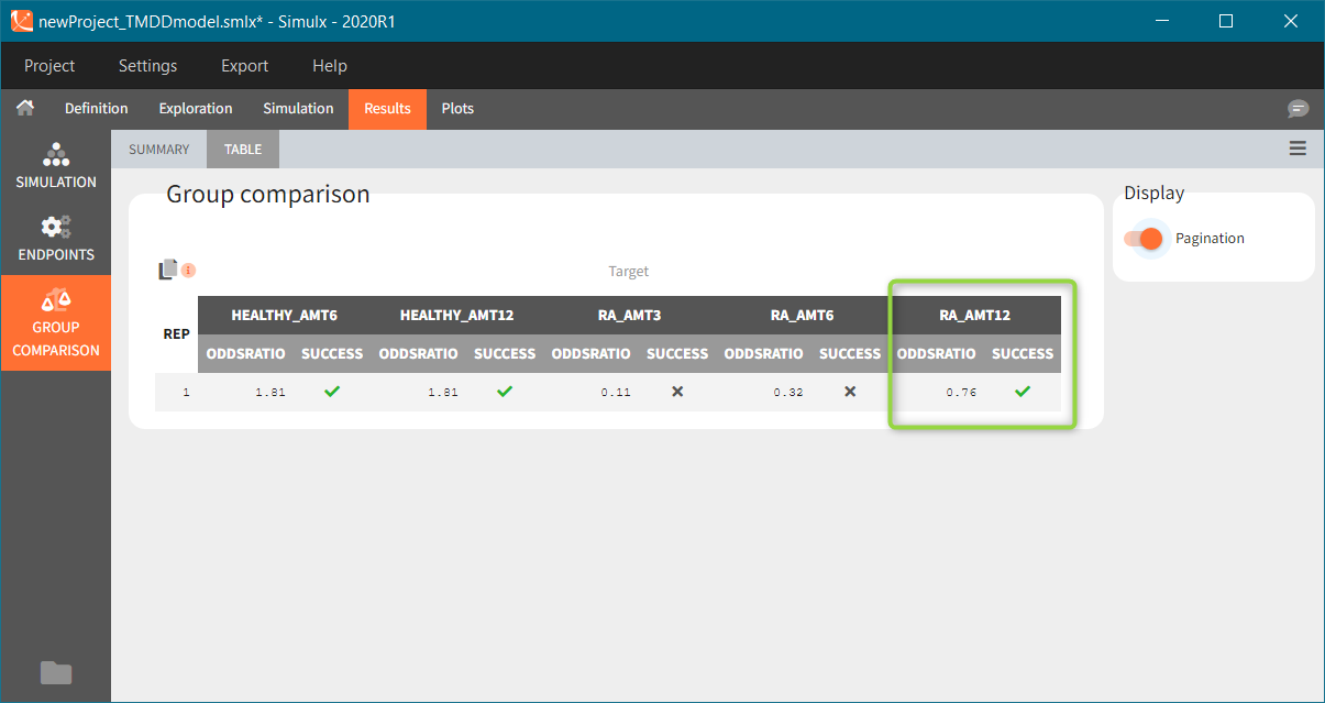 The outcomes&endpoints section defines post-processing of the simulation outputs for post-processing, which helps to compare the groups. The main endpoint is the percentage of individuals reaching the efficacy target in each group. It summarizes the “true” outcomes, which correspond to the situation when the ratio between the free receptor and the baseline at the end of the treatment is less then 10% (green frame). In addition, the “group comparison” (blue frame) compares the endpoints of all groups with respect to the reference group (healthy population with 3mg/kg dose level).