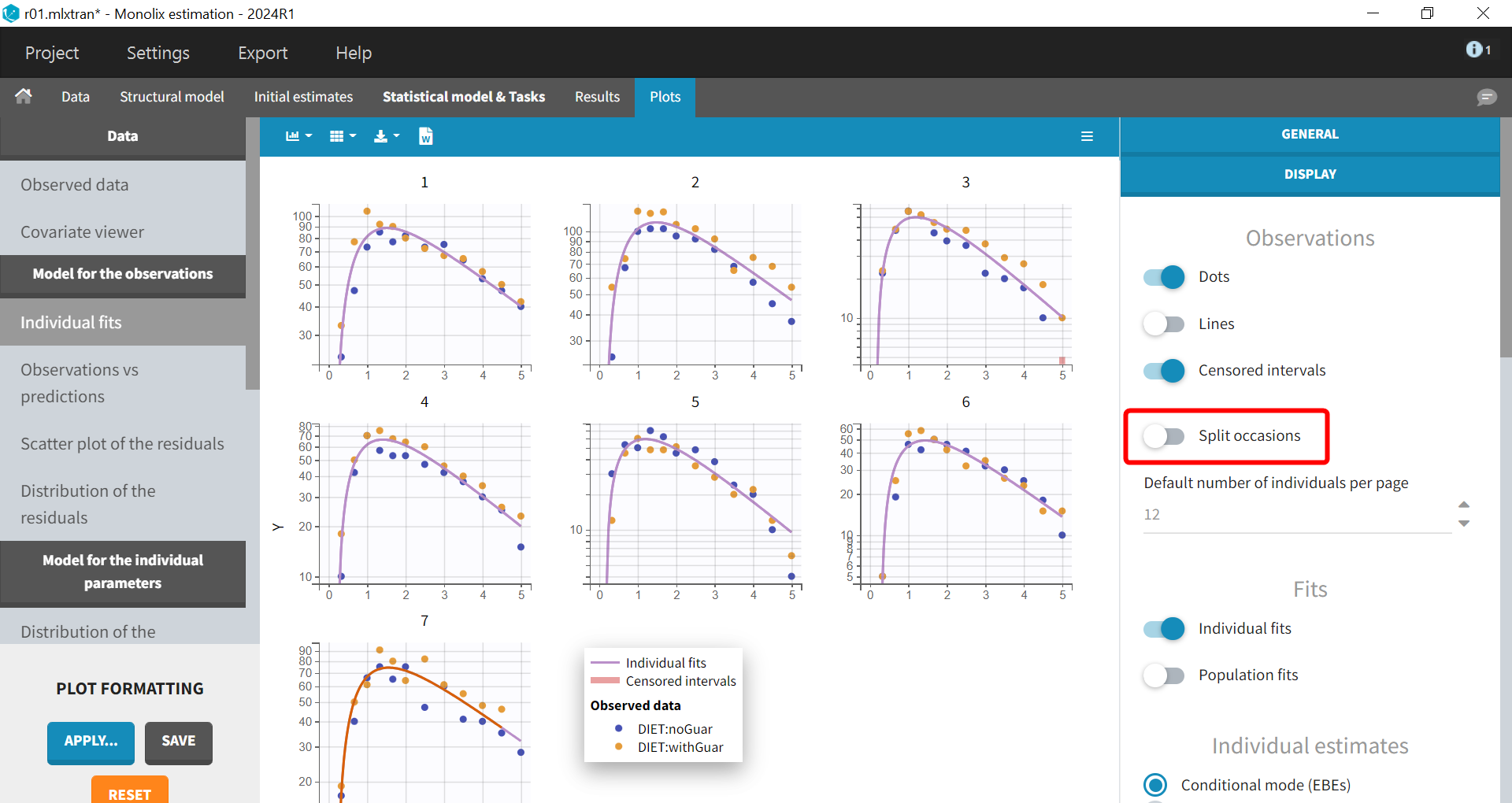 On the individual fits seen below, disabling the option “Split occasions” in “Display” allows to visualize the two occasions on the same plot for each individual. The observed data can be colored by occasion or equivalently by DIET in Stratify.