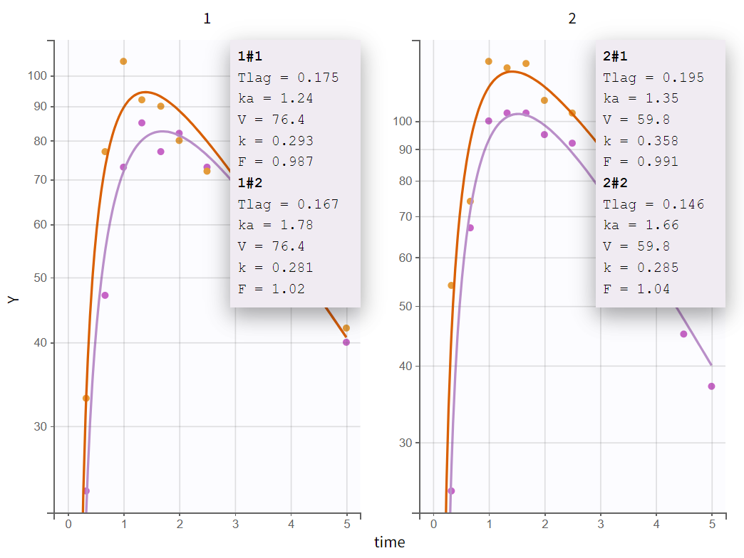 The individual fits shows that capturing both occasions with the same prediction is not possible, because there are small non-random variations from one occasion to another, as seen during the data exploration. This could corresponds to variability in the parameters between the occasions, that could be captured in the “Statistical model & Tasks” tab, by adding some random effects at the inter-occasion level or defining a covariate effect of DIET. The initial focus will be on incorporating random effects.