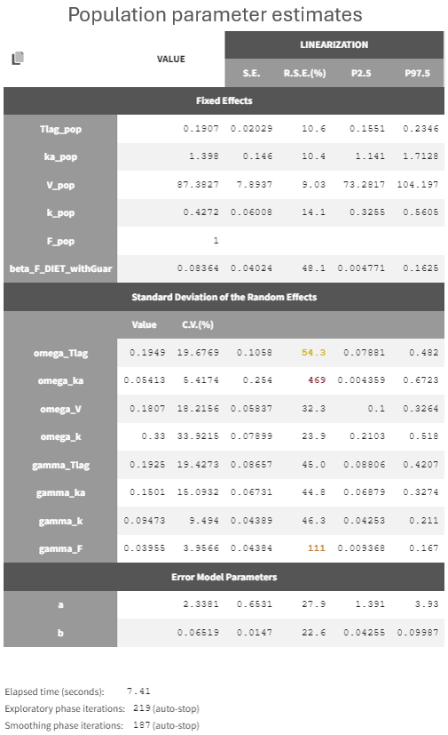 This video provides a detailed explanation of this option. Briefly, it constrains the variance of random effects to decrease gradually during estimation, which helps explore a broader parameter space and avoid getting stuck in local maxima. However, simulated annealing can also lead to artificially high omega values and hinder the identification of parameters with true zero variability, resulting in large standard errors. Therefore, when large standard errors are observed for random effects, such as omega_ka and gamma_F in this case, it is advisable to disable simulated annealing once the estimated parameters approach the solution.