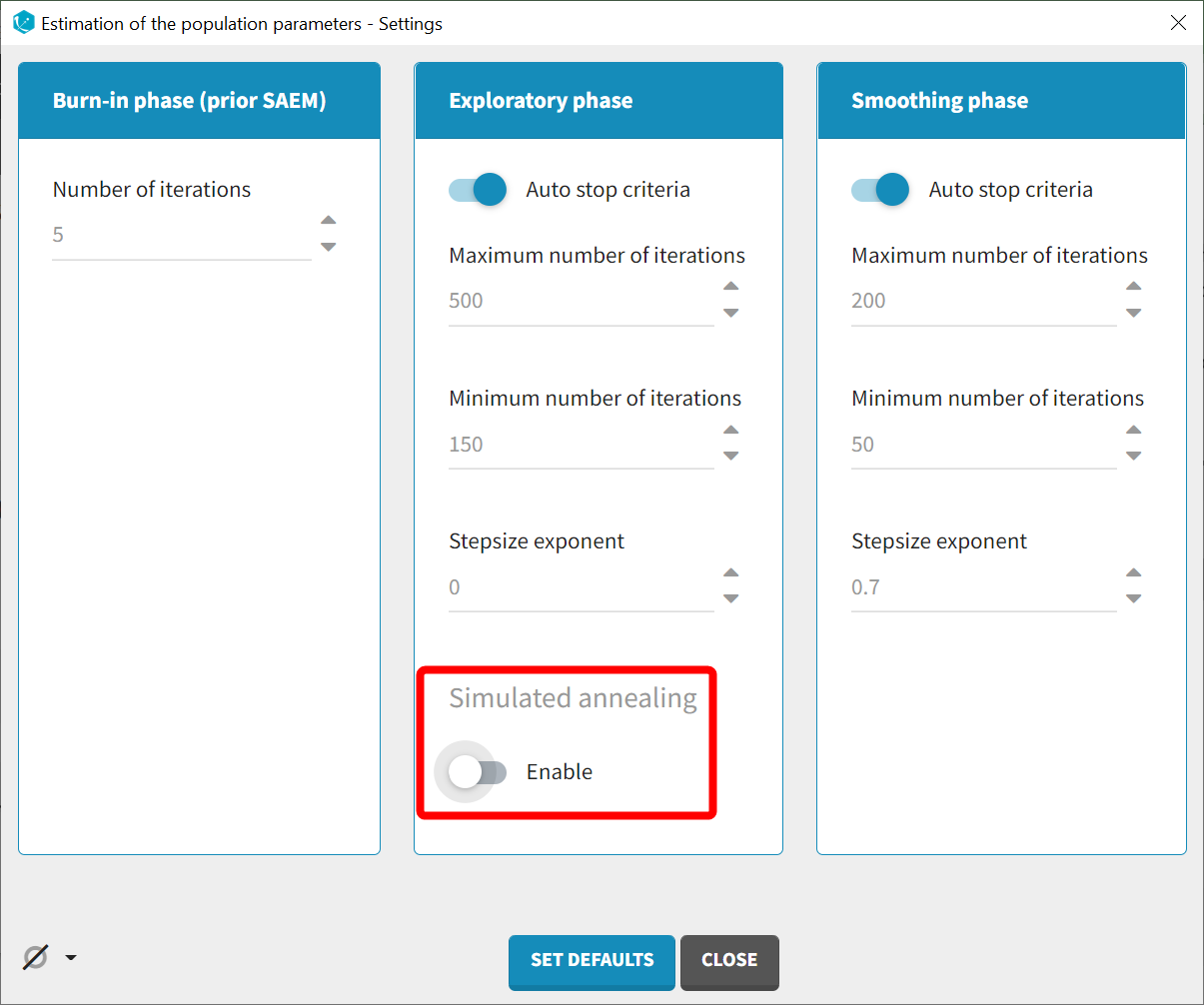 In the subsequent run, the settings of SAEM will be adjusted to disable simulated annealing.