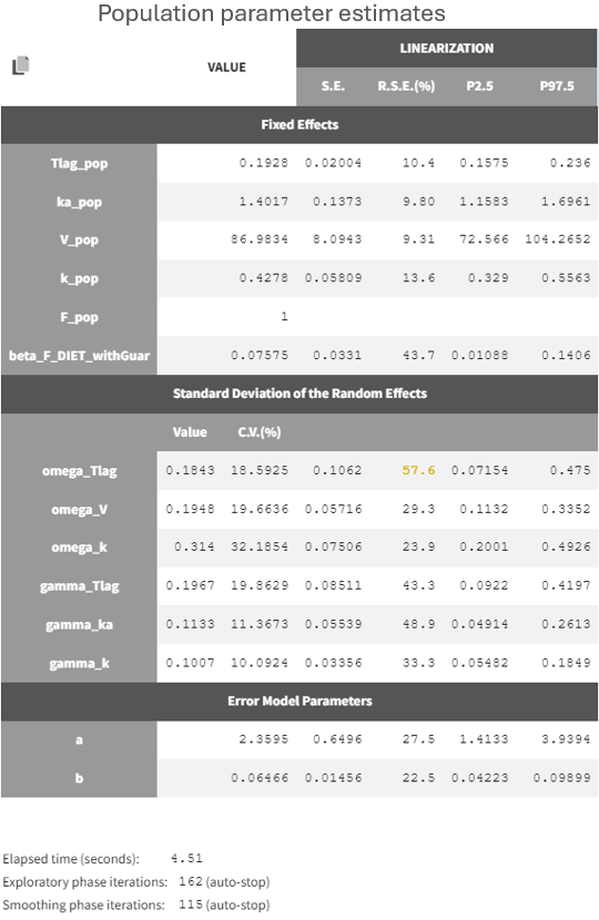 This confirms that the data does not provide sufficient information to identify the distributions for ka and F. Consequently, the last estimates should be used, and the inter-individual variability (IIV) on kak_aka and the inter-occasion variability (IOV) on FFF can be removed. The IOV on F can be eliminated while retaining the covariate effect of DIET, as F also exhibits no IIV.
