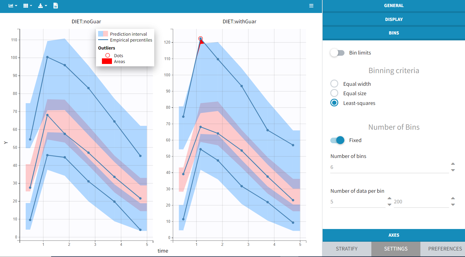 With the default setting of 4 bins, the empirical curves align well with the prediction intervals, indicating that small differences due to guar gum are not significantly affecting the model with this data size. However, increasing the number of bins to 6 reveals a minor discrepancy during the absorption phase. While the empirical percentiles are based on a limited number of individuals, this observation suggests that considering the impact of guar gum on absorption or bioavailability may be relevant.
