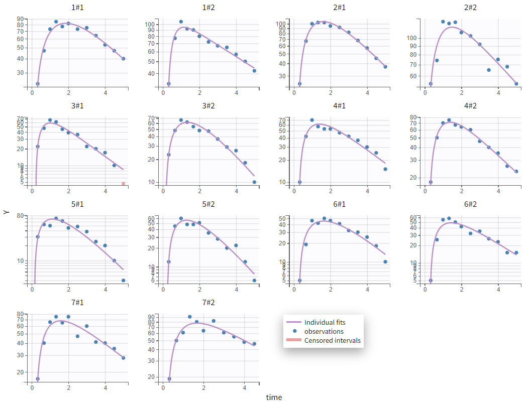 Selecting a one-compartment model with first-order absorption and linear elimination yields the following individual fits (after setting initial values using the "aut-init" button):