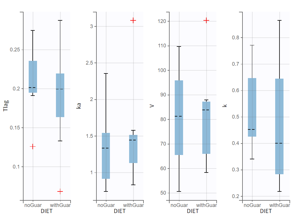 Additionally, the current model does not explicitly account for bioavailability, as it is not identifiable with only extravascular administrations and is thus included in the apparent volume, V. Monolix offers the capability to utilize more complex models beyond the basic PK models available in the library, including the explicit incorporation of bioavailability. This allows for a more meaningful evaluation of whether guar gum affects the relative bioavailability in relation to DIET.